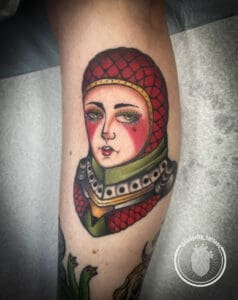 Her style closely resembles that of traditional tattooing, using bold lines and bright colors, but with a touch of darkness. She loves drawing flowers, skulls, lady heads, hands, Japanese traditional, insects, birds, mushrooms, clowns etc. Think a little horror, but make it fun.